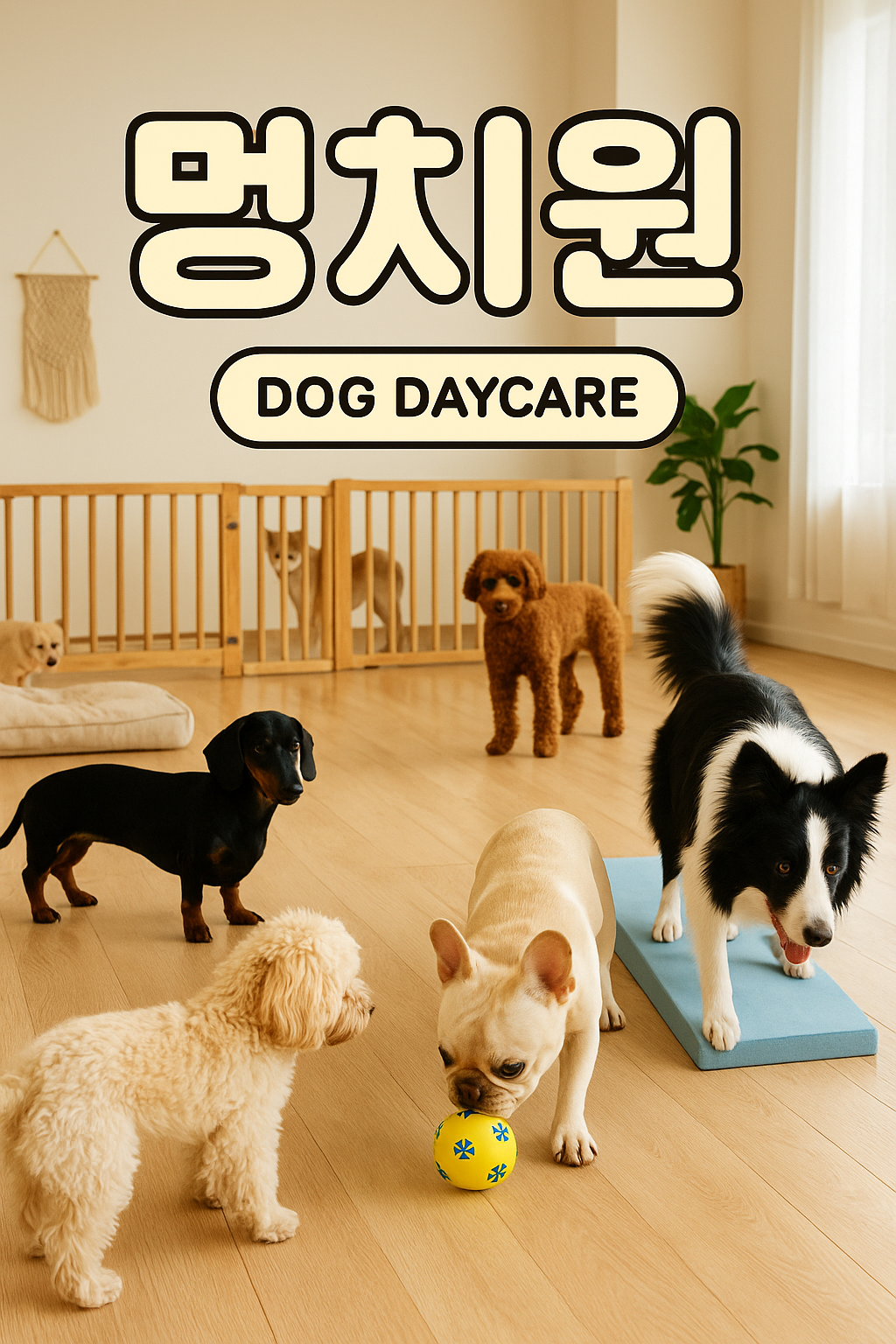 사람의 유치원처럼 하루 일정 시간 동안 강아지의 신체 활동, 사회성 훈련, 기본 예절 교육, 놀이 등의 프로그램을 운영하여, 단순한 돌봄을 넘어 반려견의 정신적·육체적 성장까지 도모하는 공간입니다.
